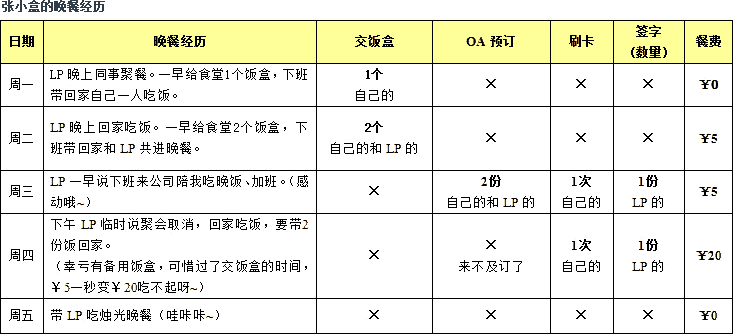 张小盒说:1、交饭盒:OA不预定、不刷卡、不签字。2、不交饭盒:OA预订、刷卡或签字。 3、饭盒好啊!不需要长期预订,想吃就给饭盒,不想吃就不给。不怕因忘记预订而多给钱。 4、饭盒妙啊!下班拿了就跑,既省时,又省力。